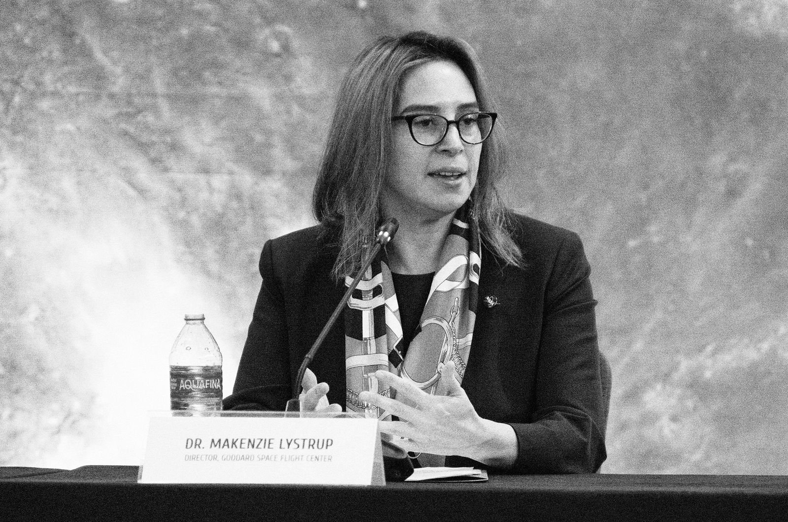 Alt text: Makenzie Lystrup durante um painel em Washington, DC, representando a NASA.