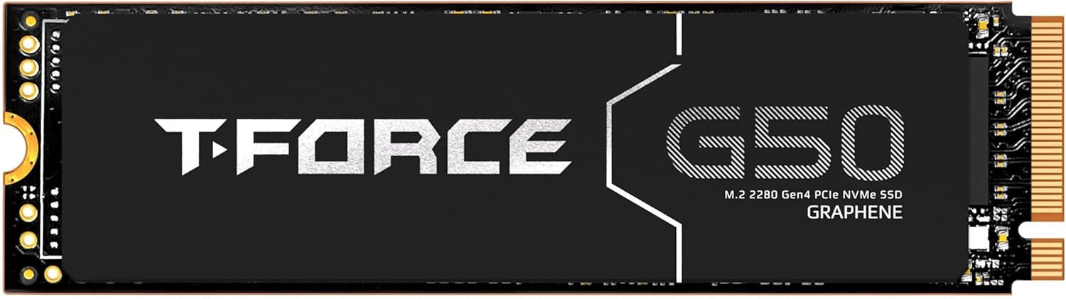 Legenda: O TEAMGROUP T-FORCE G50 1TB é um SSD NVMe PCIe Gen4x4 M.2 2280 com desempenho de leitura de até 5.000 MB/s e gravação de 4.800 MB/s, dissipador de calor de grafeno ultrafino e garantia de 5 anos.